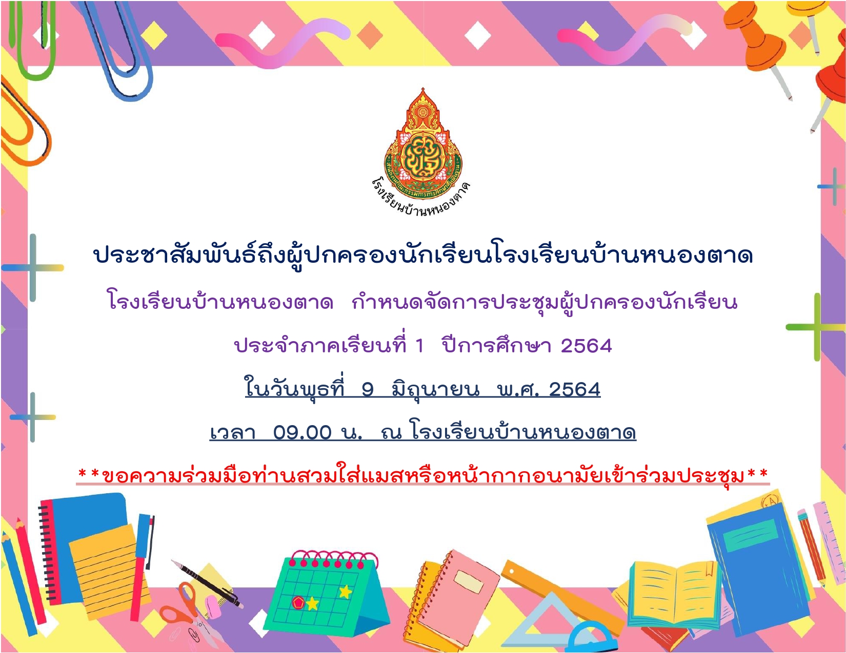โรงเรียนบ้านหนองตาดกำหนดจัดการประชุมผู้ปกครองนักเรียน เพื่อชี้แจงทำความเข้าใจการเรียนการสอนในภาคเรียนที่ 1 ปีการศึกษา 2564 ในวันพุธ ที่ 9 มิถุนายน พ.ศ. 2564 เวลา 09.00 น. ณ โรงเรียนบ้านหนองตาด